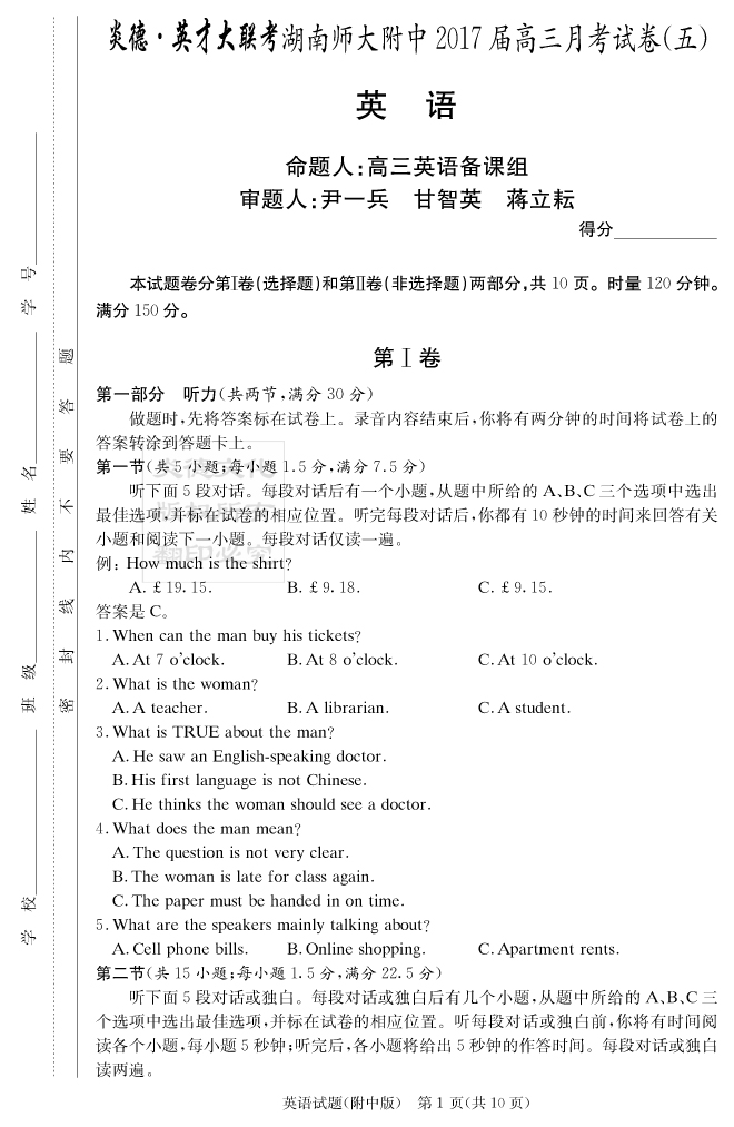【英語】炎德英才大聯(lián)考2017師大附中高三5次月考