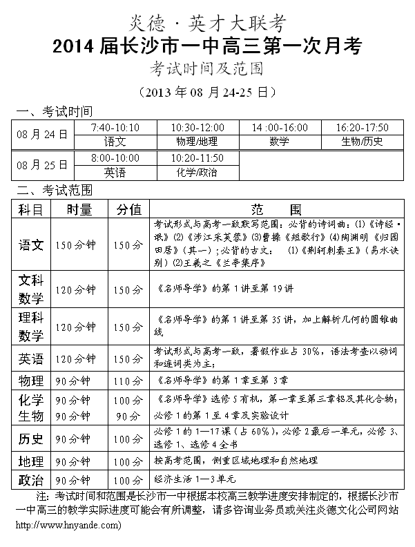 炎德英才大聯(lián)考長(zhǎng)沙市一中2014屆高三長(zhǎng)沙市一中第一次月考考試時(shí)間和范圍(2013.08.24