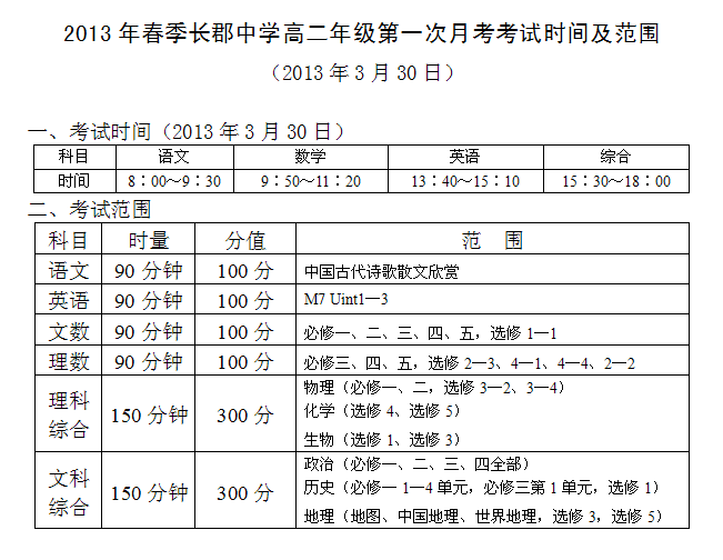 2013年春季長(zhǎng)郡中學(xué)高二第一次月考考試時(shí)間范圍(2013.03.30)