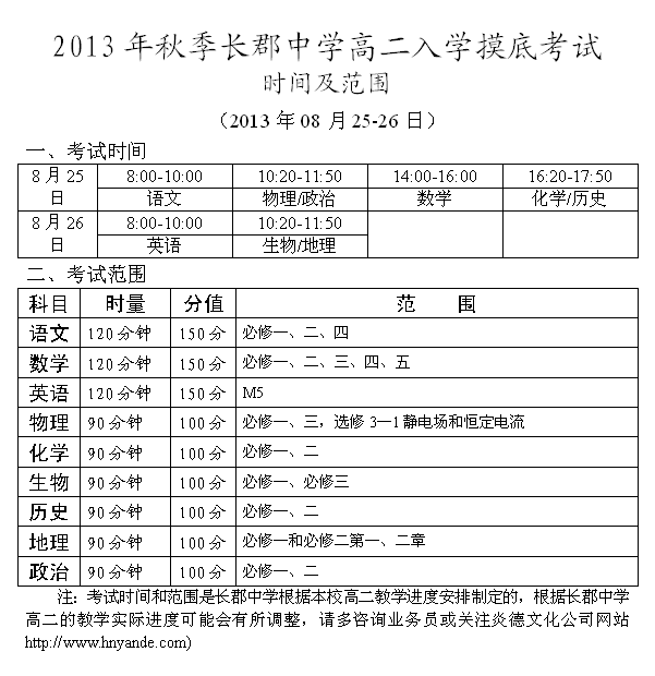 2013年秋季長(zhǎng)郡中學(xué)高二入學(xué)摸底考試時(shí)間和范圍(2013.08.25-26)