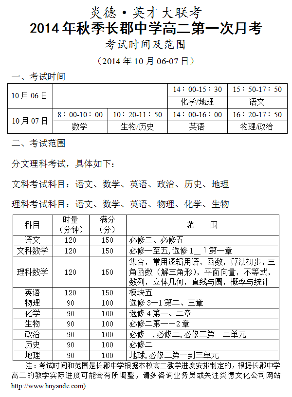 炎德英才大聯(lián)考2014年秋季長(zhǎng)郡中學(xué)高二第一次月考考試時(shí)間和范圍(2014.10.06-07)