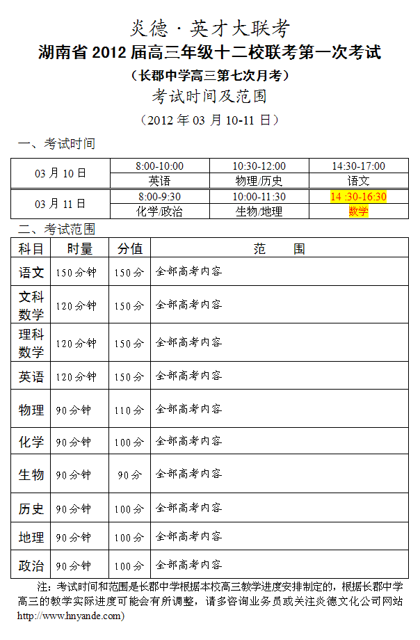 炎德英才大聯(lián)考長(zhǎng)郡中學(xué)2012屆高三第七次月考(湖南省2012屆十二校聯(lián)考一)考試時(shí)間和范