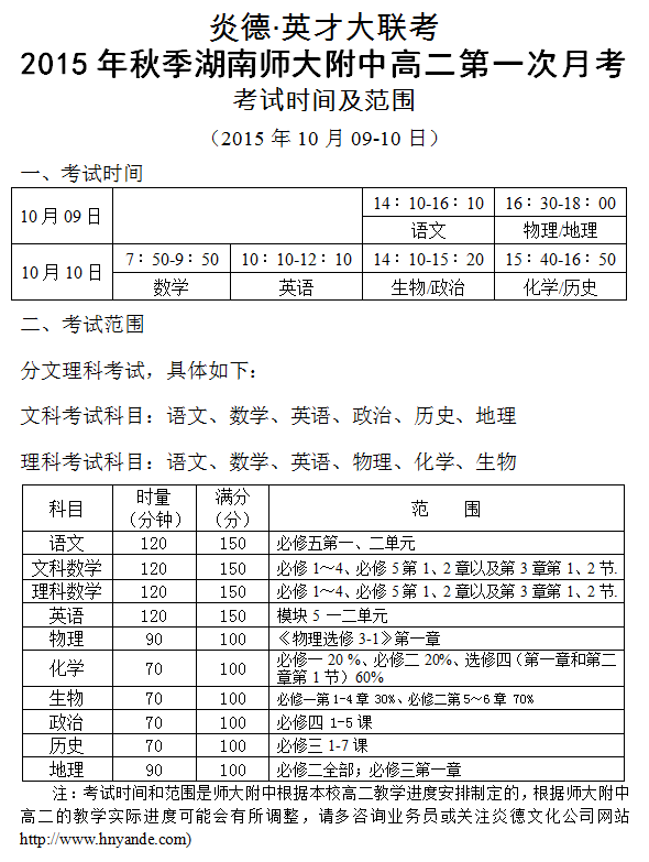 炎德英才大聯(lián)考2015年秋季湖南師大附中高二第一次月考考試時(shí)間和范圍(2015.10.09-10)