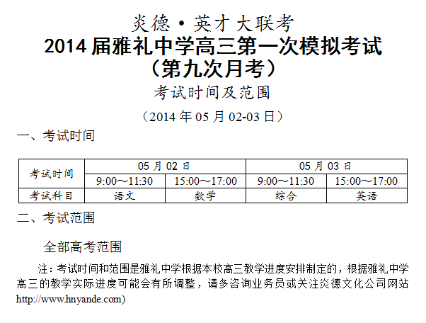 炎德英才大聯(lián)考雅禮中學(xué)2014屆高三第一次模擬(第9次月考)考試時間和范圍(2014.05.0