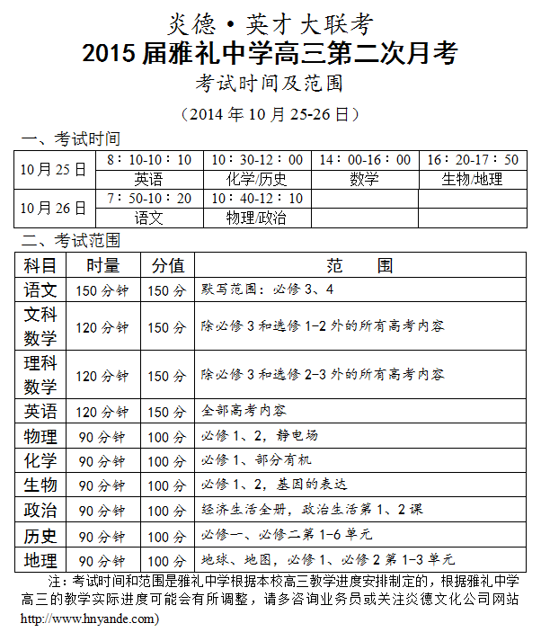 炎德英才大聯(lián)考雅禮中學(xué)2015屆高三第2次月考考試時間和范圍(2014.10.25-26)