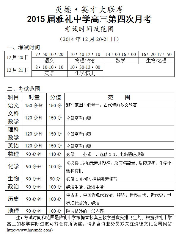 炎德英才大聯(lián)考雅禮中學(xué)2015屆高三第4次月考考試時間和范圍(2014.12.20-21)