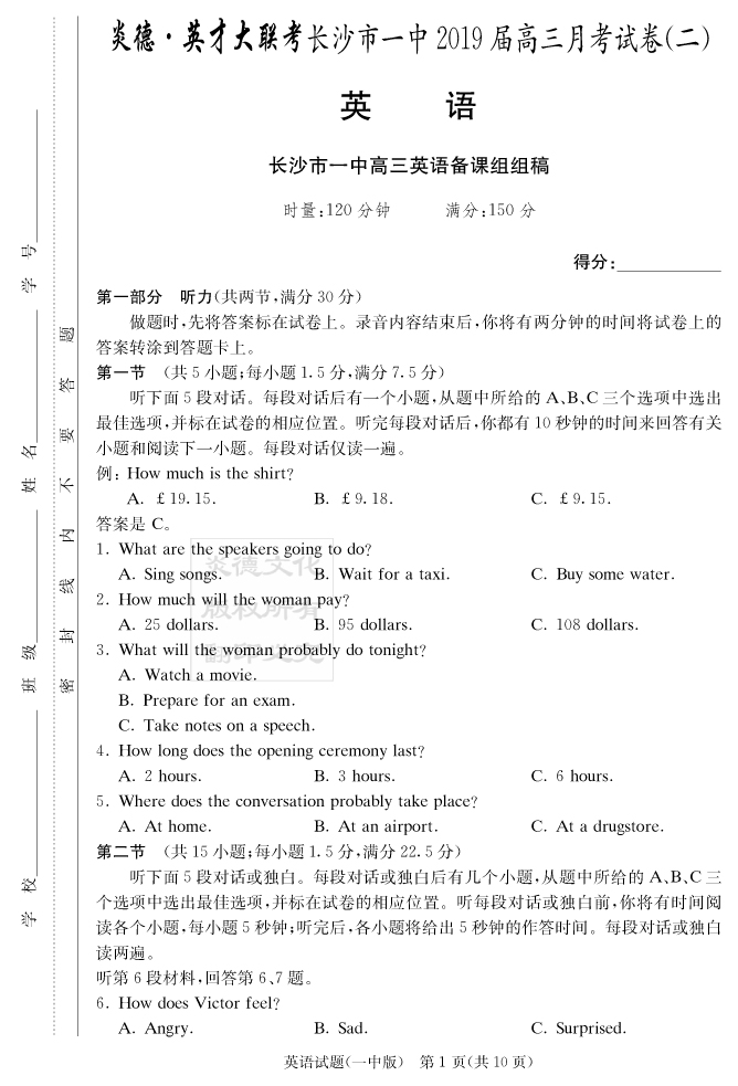 【英語】炎德英才大聯(lián)考2019長沙一中高三2次月考