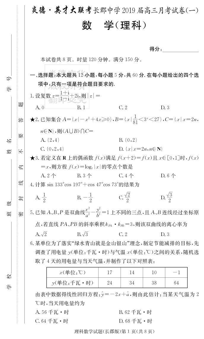 【理數(shù)】炎德英才大聯(lián)考2019長(zhǎng)郡中學(xué)高三1次月考
