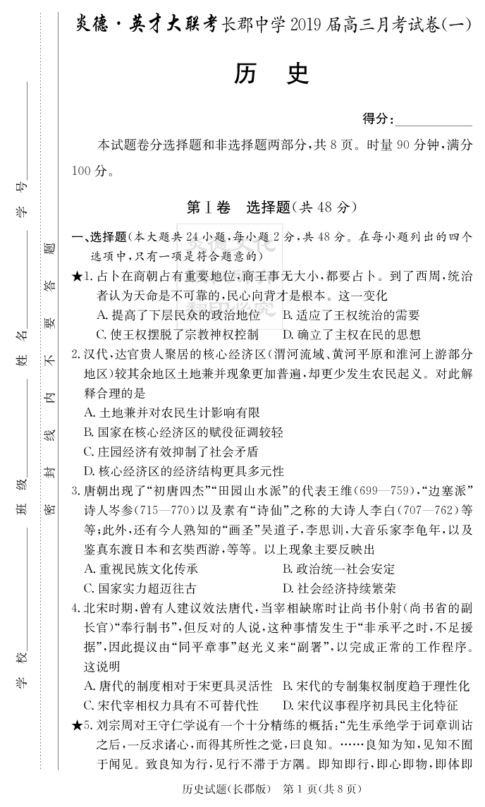 【歷史】炎德英才大聯(lián)考2019長郡中學(xué)高三1次月考