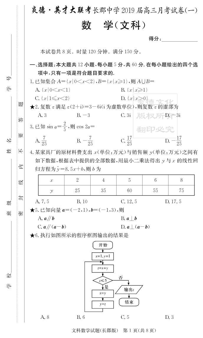 【文數(shù)】炎德英才大聯(lián)考2019長郡中學(xué)高三1次月考
