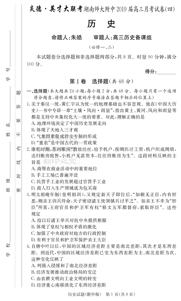 【歷史】炎德英才大聯(lián)考2019師大附中高三4次月考