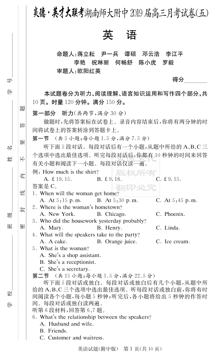 【英語(yǔ)】炎德英才大聯(lián)考2019師大附中高三5次月考