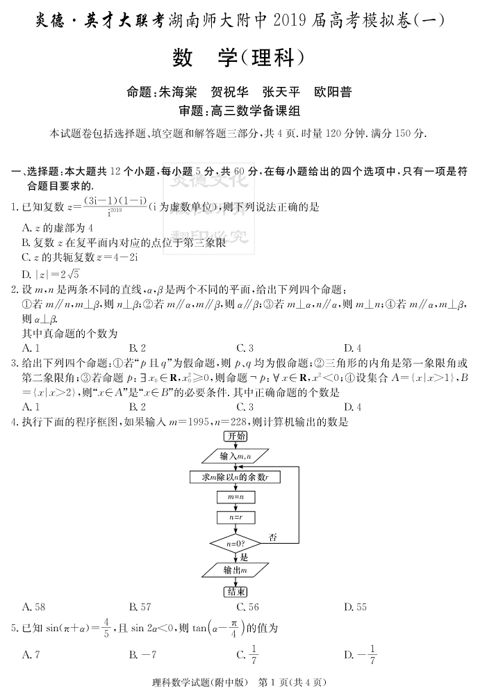 【理數(shù)】炎德英才大聯(lián)考2019師大附中高三8次月考(模擬一)