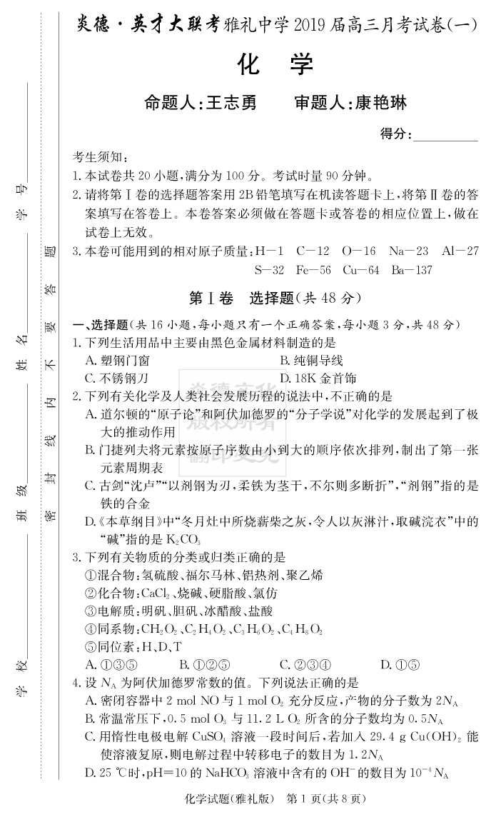 【化學(xué)】炎德英才大聯(lián)考2019雅禮中學(xué)高三1次月考