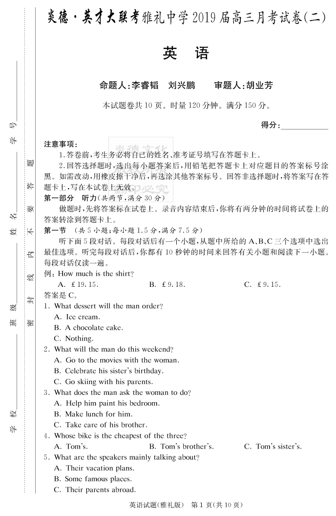 【英語(yǔ)】炎德英才大聯(lián)考2019雅禮中學(xué)高三2次月考