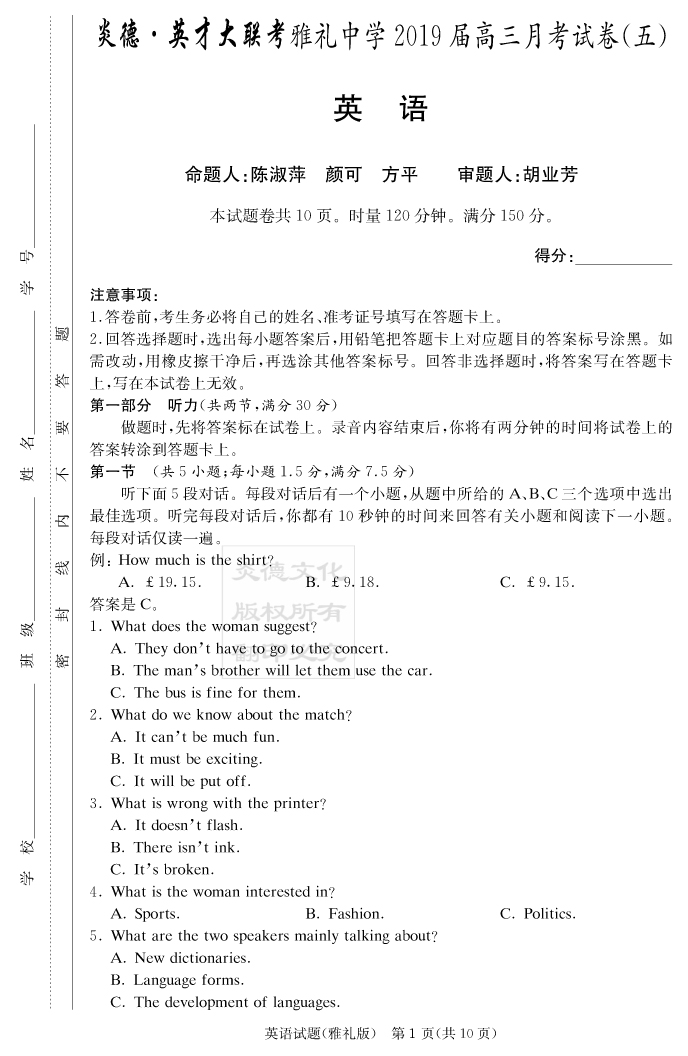 【英語(yǔ)】炎德英才大聯(lián)考2019雅禮中學(xué)高三5次月考