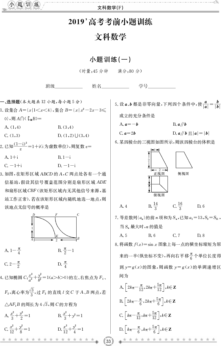 【文數(shù)】師大附中、長(zhǎng)沙一中2019高考考前小題訓(xùn)練