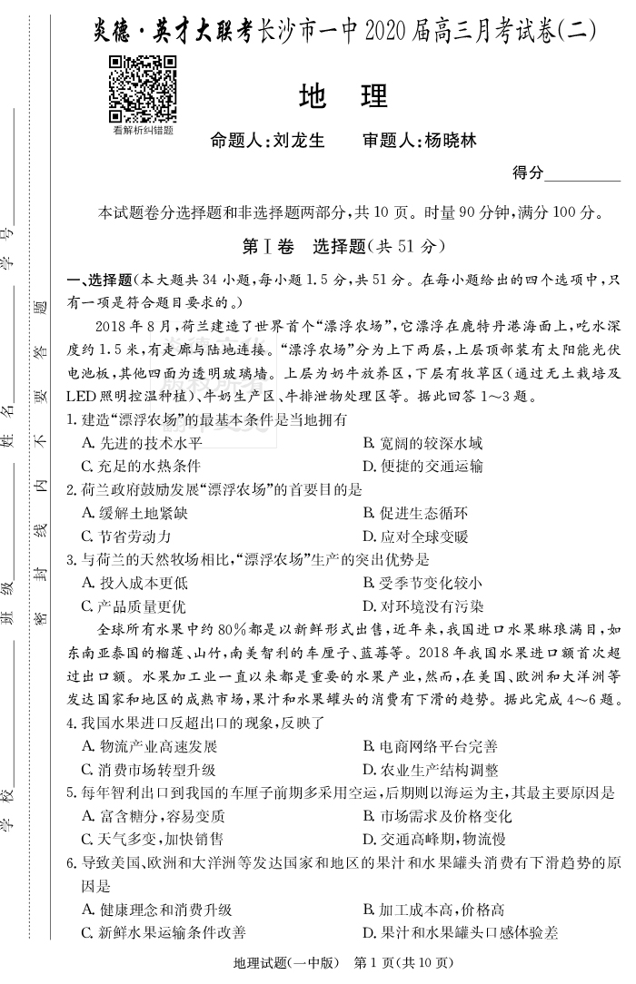 2026長郡中學新高考考前小題沖刺訓練·地理