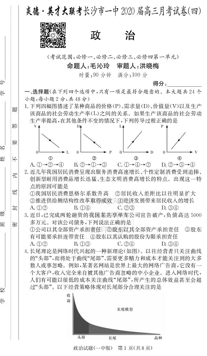 【政治】炎德英才大聯(lián)考2020屆長沙市一中高三4次月考