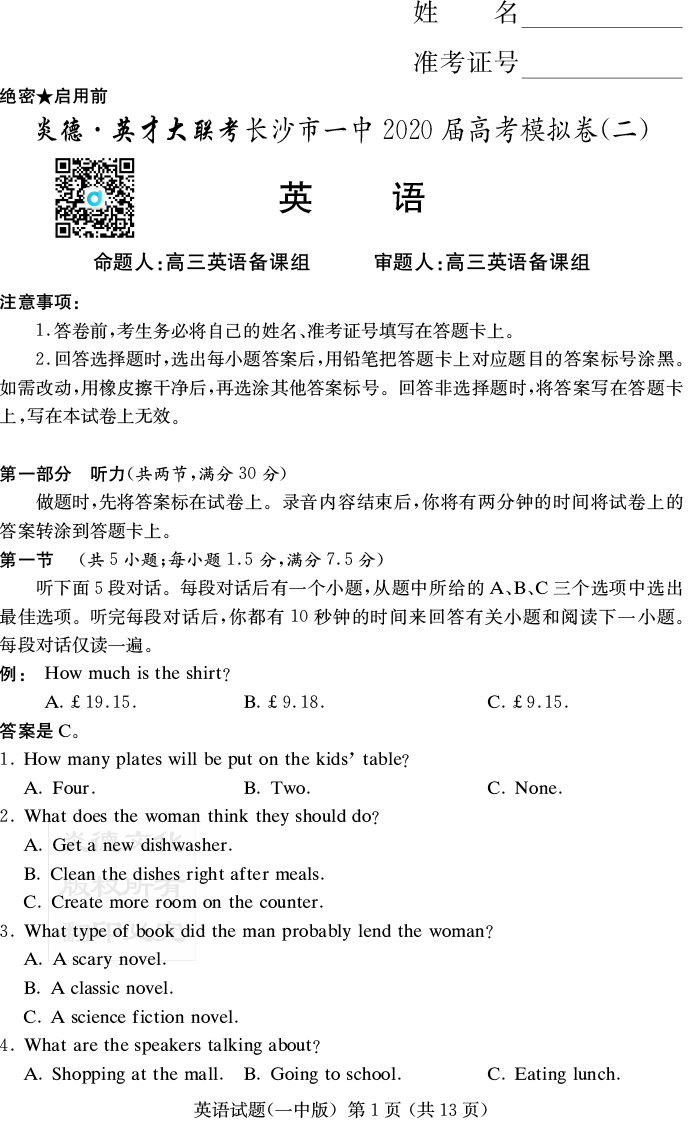 【英語】炎德英才大聯(lián)考2020屆長沙市一中高三10次月考(模擬二)