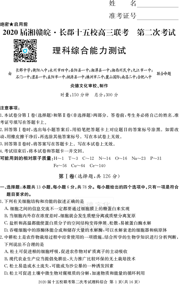 【理綜】炎德英才大聯(lián)考2020屆長郡中學高三8次月考(十五校聯(lián)考一)