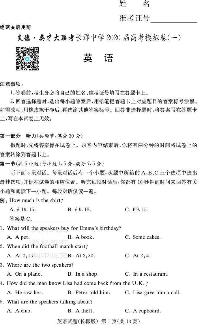 【英語】炎德英才大聯(lián)考2020屆長(zhǎng)郡中學(xué)高三9次月考(模擬一)