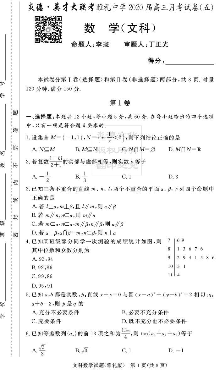 【文數(shù)】炎德英才大聯(lián)考2020屆雅禮中學(xué)高三5次月考