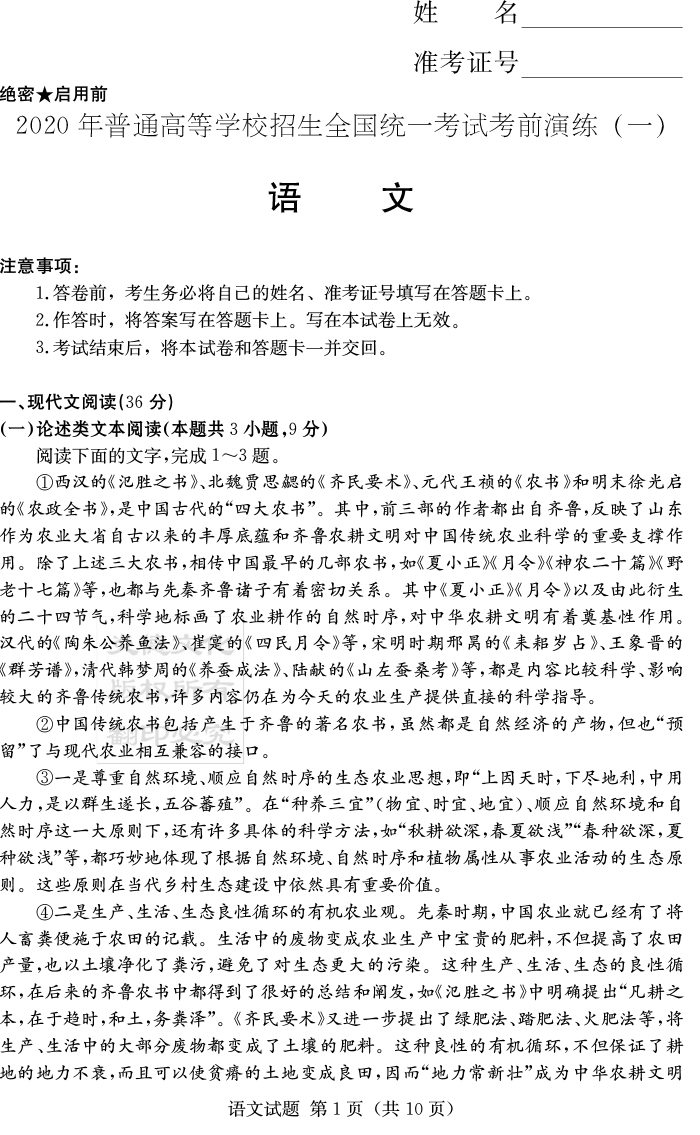 【語文】2020年普通高等學(xué)校招生全國統(tǒng)一考試考前演練(一)
