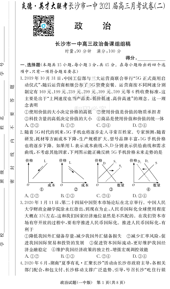 【政治】炎德英才大聯(lián)考2021屆長沙市一中高三2次月考