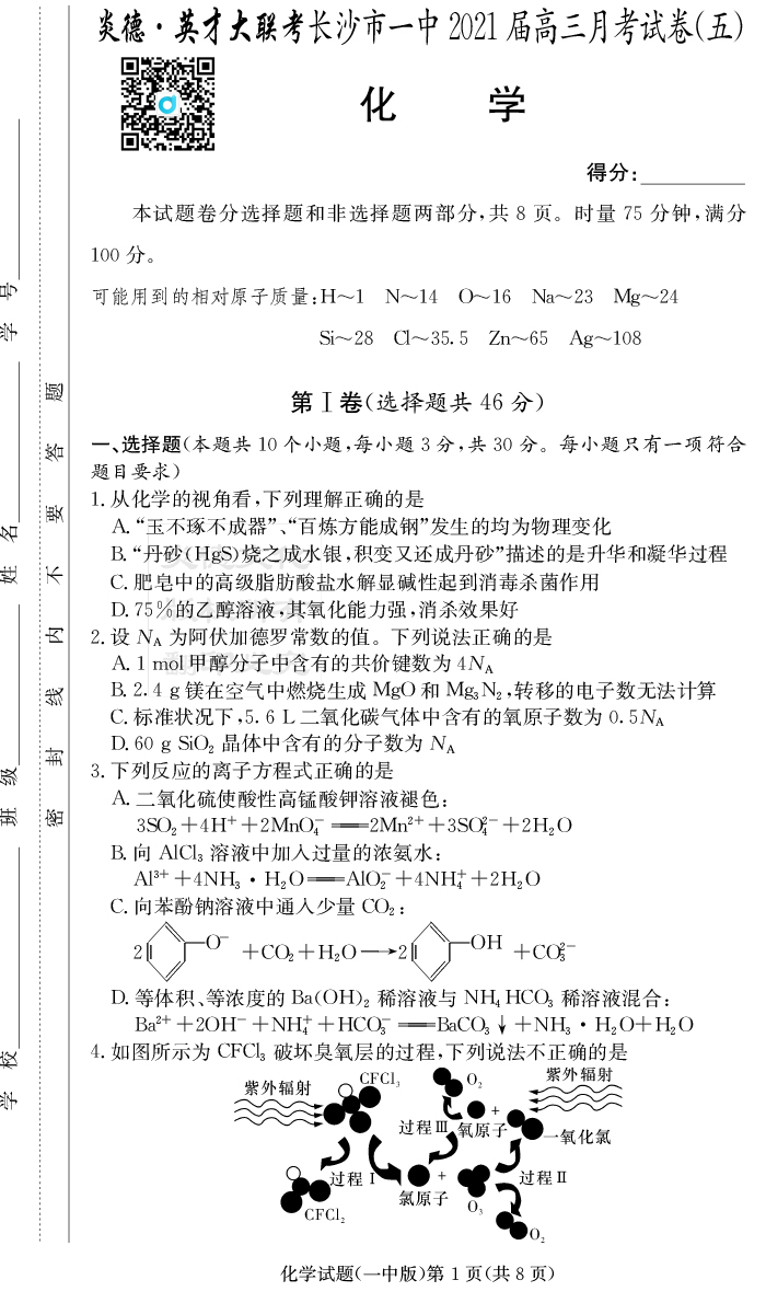 【化學(xué)】炎德英才大聯(lián)考2021屆長沙市一中高三5次月考