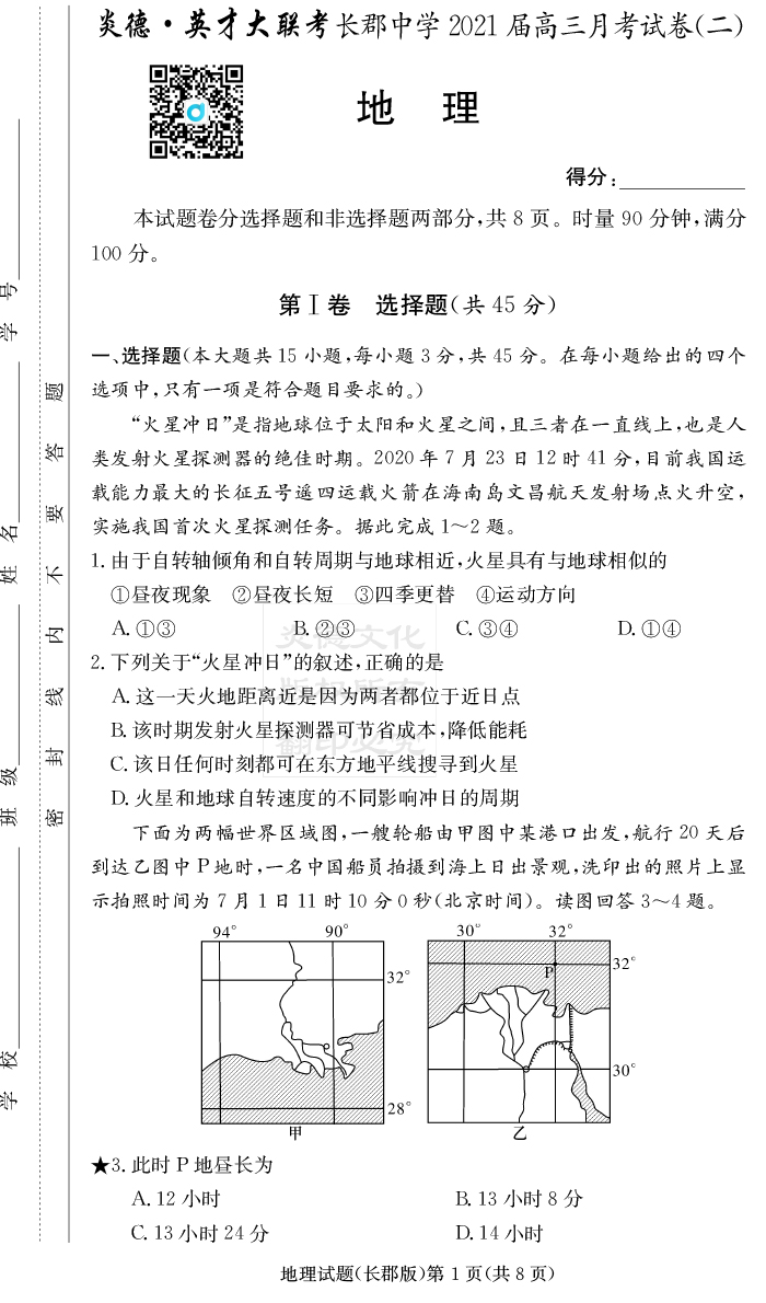 【地理】炎德英才大聯(lián)考2021屆長郡中學(xué)高三2次月考