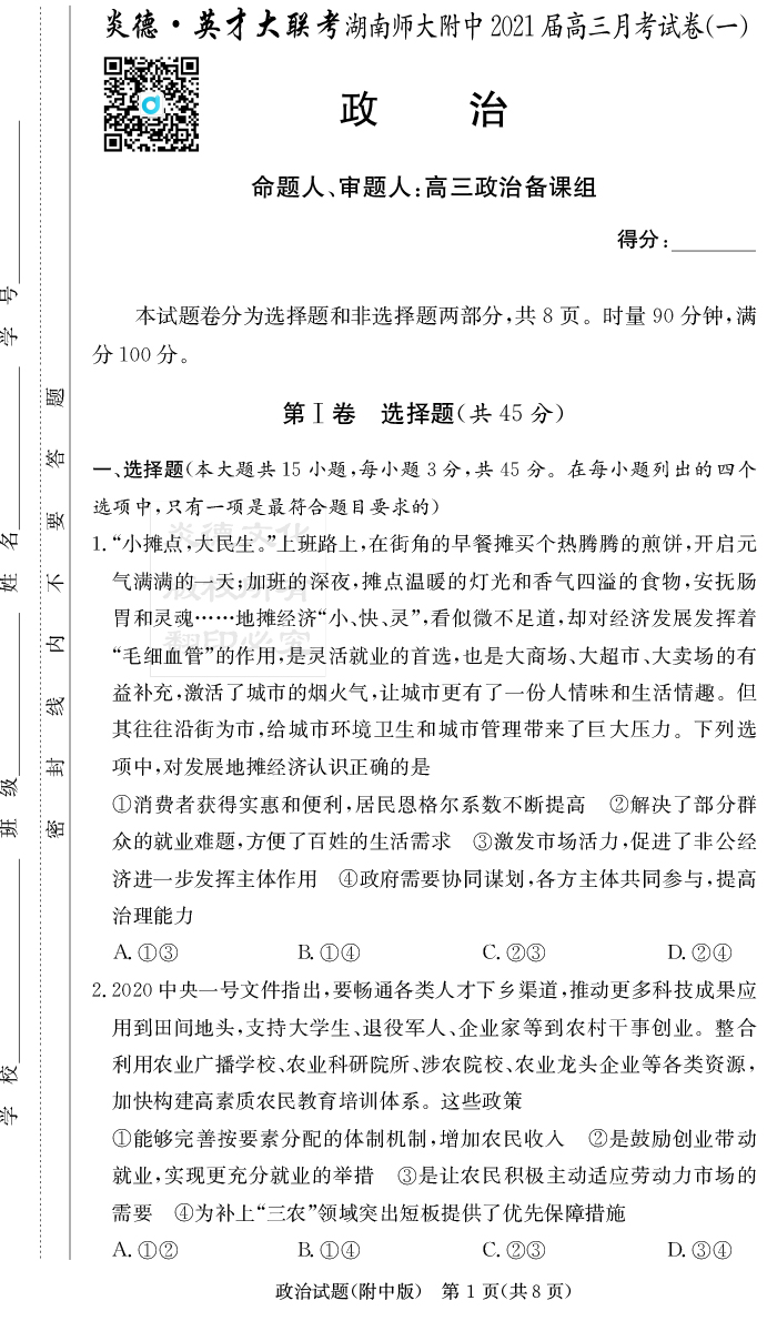 【政治】炎德英才大聯(lián)考2021屆湖南師大附中高三1次月考