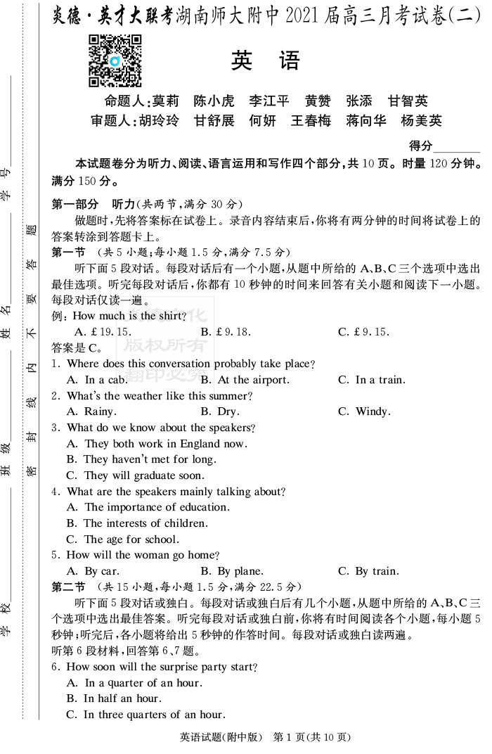 【英語(yǔ)】炎德英才大聯(lián)考2021屆湖南師大附中高三2次月考