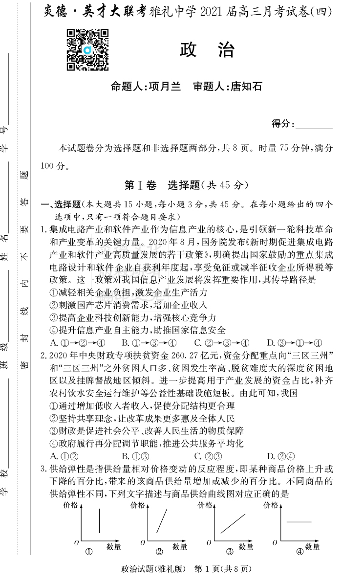 【政治】炎德英才大聯(lián)考2021屆雅禮中學(xué)高三4次月考