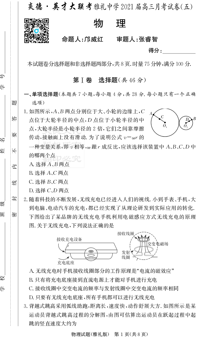 【物理】炎德英才大聯(lián)考2021屆雅禮中學高三5次月考