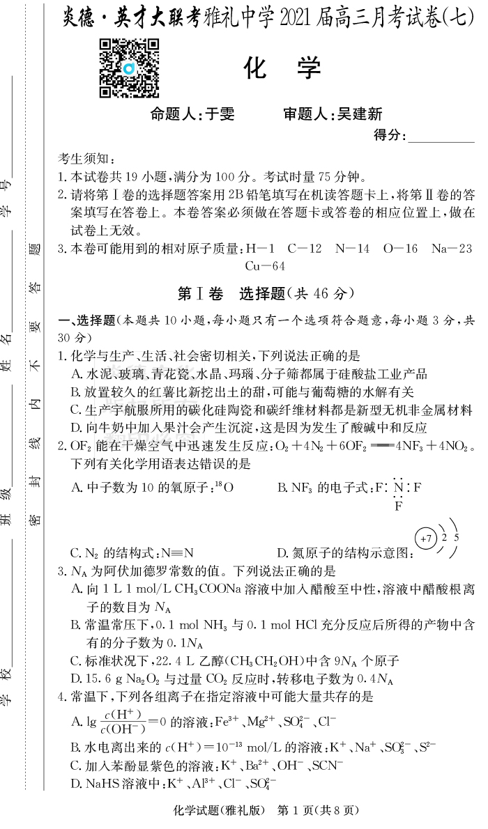 【化學(xué)】炎德英才大聯(lián)考2021屆雅禮中學(xué)高三7次月考