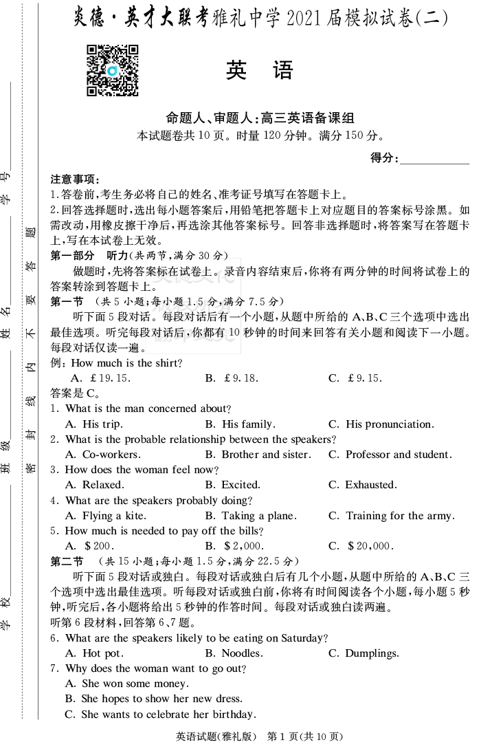 【英語(yǔ)】炎德英才大聯(lián)考2021屆雅禮中學(xué)高三10次月考(模擬二)