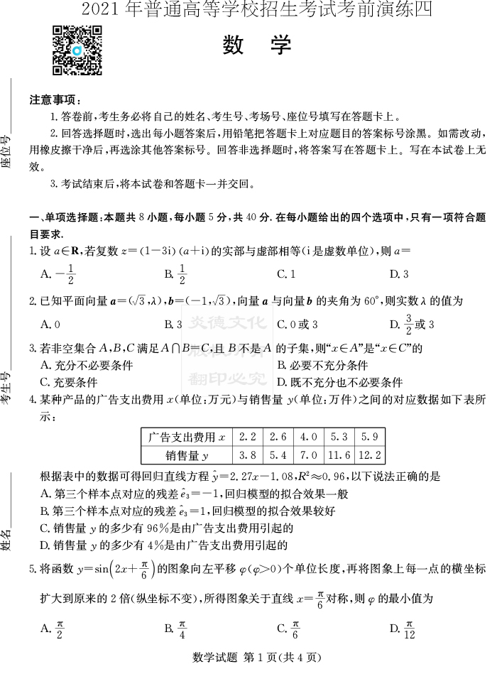 【數(shù)學(xué)】2021年普通高等學(xué)校招生全國統(tǒng)一考試考前演練(四)