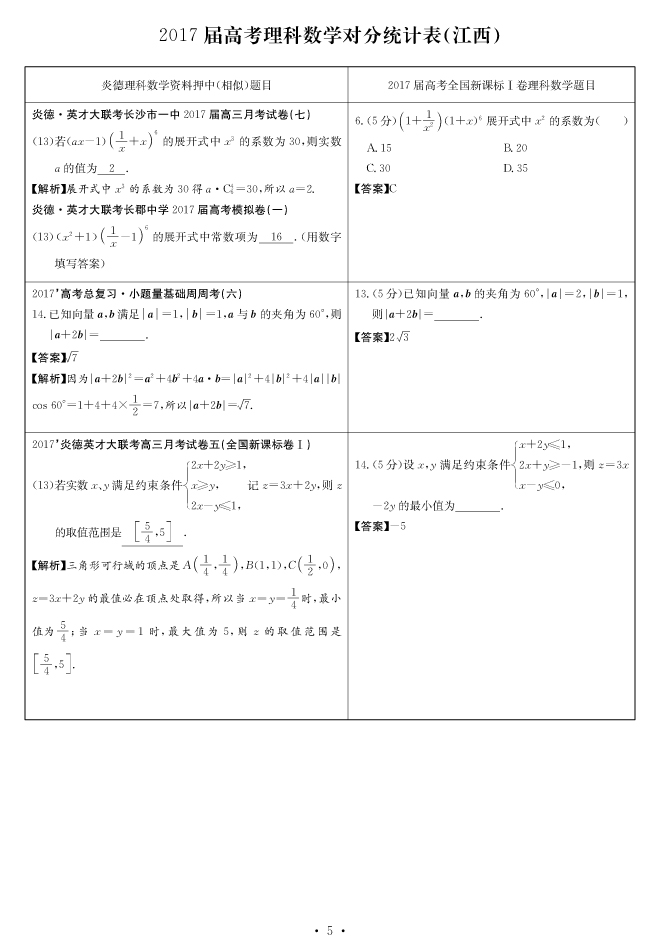 2017高考全國(guó)新課標(biāo)卷Ⅰ對(duì)分表-理數(shù)