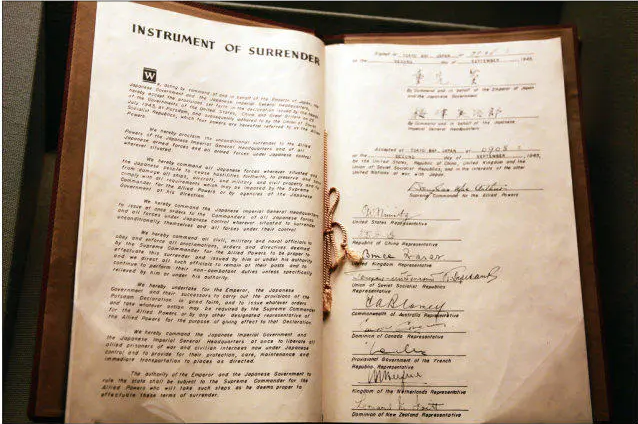 1945年8月15日,裕仁天皇向全國(guó)進(jìn)行廣播接受《波茨坦公告》并且頒布無(wú)條件投降詔書(shū),宣布向盟國(guó)無(wú)條件投降。盟軍最高司令麥克亞瑟隨即率美、中、英、蘇、澳、加、法、荷、新等國(guó)的代表赴日本受降。簽字儀式于1945年9月2日上午九時(shí)在美國(guó)海軍“密蘇里”號(hào)戰(zhàn)列艦上舉行。中國(guó)代表徐永昌上將在商震將軍陪同下代表中國(guó)在投降書(shū)上簽字。