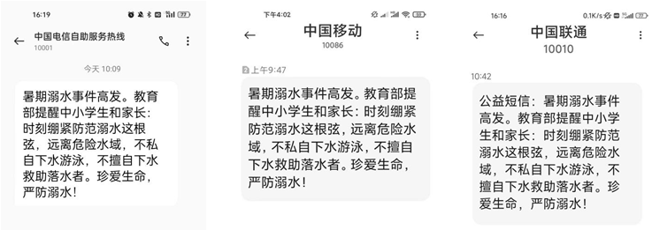 7月13日,教育部、工信部協(xié)調中國電信、中國移動、中國聯(lián)通三大運營商,向全國手機用戶發(fā)送了暑期防溺水公益短信。短信內容為:暑期溺水事件高發(fā),教育部提醒中小學生和家長,時刻緊繃防范溺水這根弦,遠離危險水域,不私自下水游泳,不擅自下水救助落水者。珍愛生命,嚴防溺水!不少學生家長收到公益短信后表示,孩子安全大意不得,將會履行好監(jiān)護職責,高度關注孩子暑期安全。